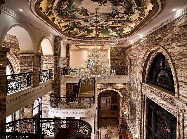 Đá ốp đại sảnh là đá hoa cương lựa chọn và nhập từ Châu Âu. Điểm đặc biệt là những viên đá được cắt nguyên khối ngay từ mỏ đá để khi ráp lại với nhau thì những đường vân đều ăn khớp và giống như một bức tranh. Nếu có viên nào không ăn khớp thì nhà thầu buộc phải dỡ bỏ cả mảng và ốp lại. Chỉ riêng tám cánh cửa đồng tại sảnh của dự án đã có giá 16 tỷ đồng và 40 người thợ cùng với 8 chuyên gia nước ngoài thi công liên tục trong vòng một tháng mới hoàn thiện. Bức tranh trên trần sảnh cần đến ba hoạ sỹ người Ý treo người trên không vẽ tay trong vòng 6 tháng, với chi phí hơn 300.000 Euro.