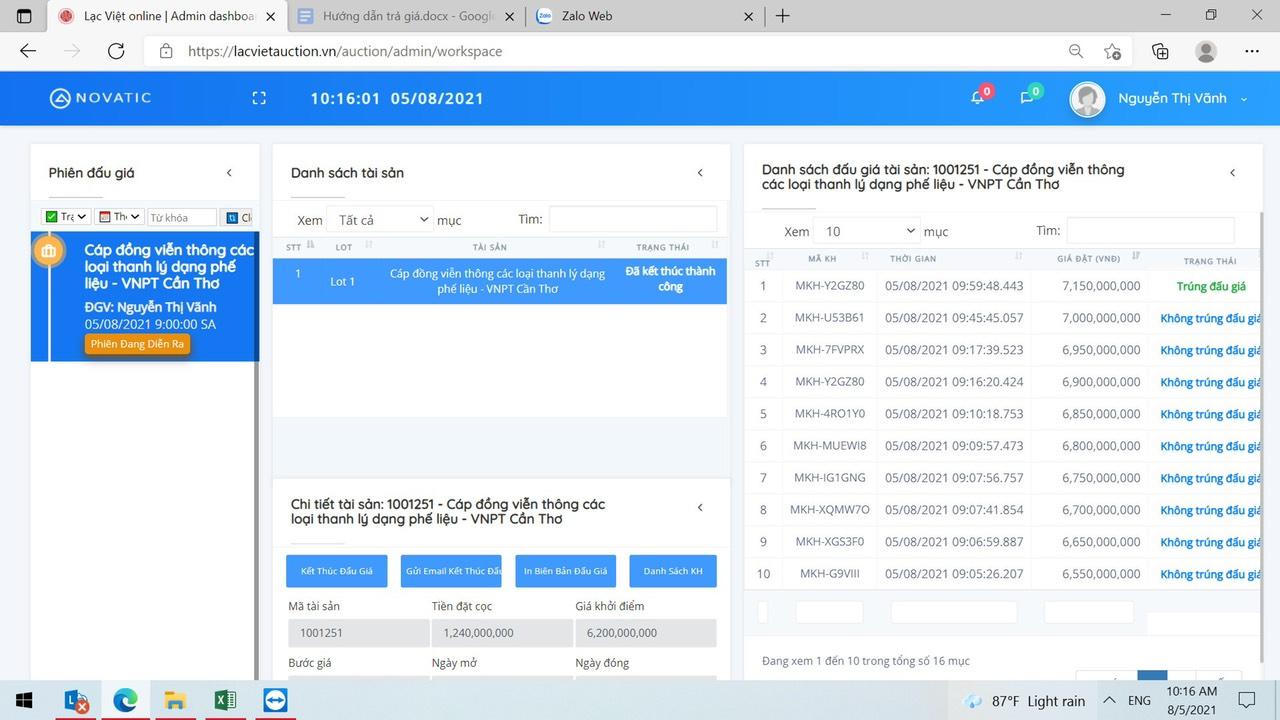 Kết quả một phiên đấu giá online của Công ty đấu giá hợp danh Lạc Việt. |
