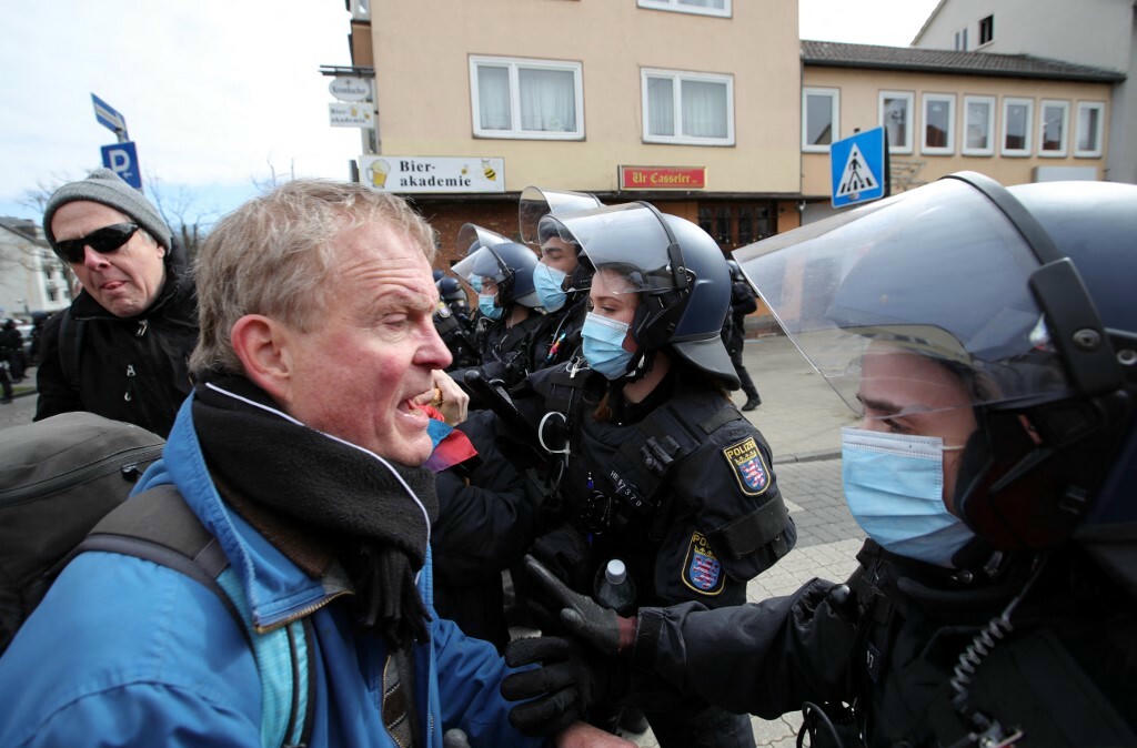 Đám đông tuần hành trên đường phố Kassel để phản đối các hạn chế ngăn COVID-19, buộc cảnh sát Đức dùng hơi cay, dùi cui để giải tán.