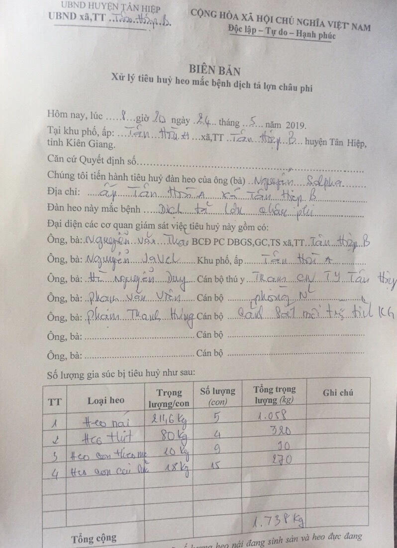 Bà Phan Kim Loan, Trưởng Phòng Nông nghiệp và Phát triển nông thôn huyện Tân Hiệp cho biết: Theo kết quả xét nghiệm cho thấy đàn heo nhà bà Pha đã mắc dịch tả heo châu Phi và buộc tiêu hủy vào sáng 24/5.