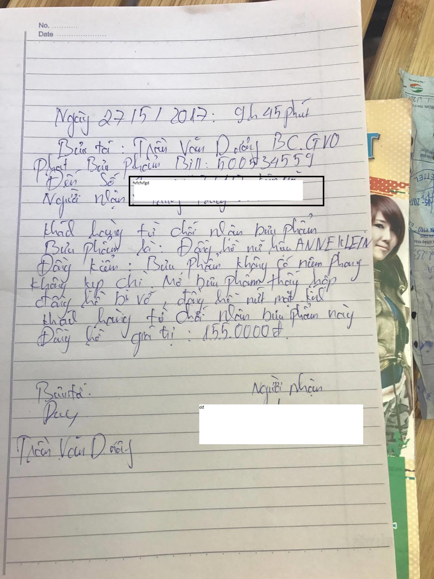 Bức xúc với sự viêc trên, chị T.L quyết định không nhận hàng và yêu cầu nhân viên của Viettel post lập biên bản sự việc tại chỗ.
