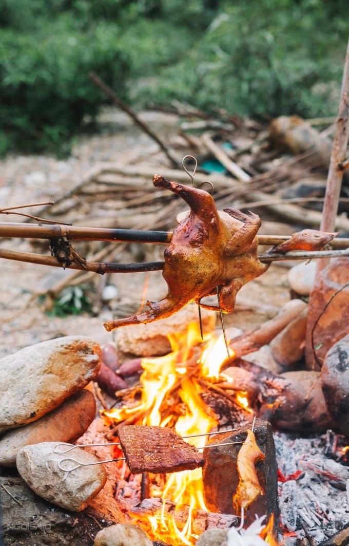 Đi chơi với tinh thần trải nghiệm nhưng phải tận hưởng, nhóm bạn mang theo nhiều đồ ăn, thức uống, tự nướng gà, thịt heo nhâm nhi. Vinh kể người anh cùng đoàn có kỹ năng nướng thịt 'điệu nghệ', da gà vàng ruộm, thịt thơm khiến cả nhóm thích mê, nhất là khi được thưởng thức giữa khung cảnh nên thơ.
