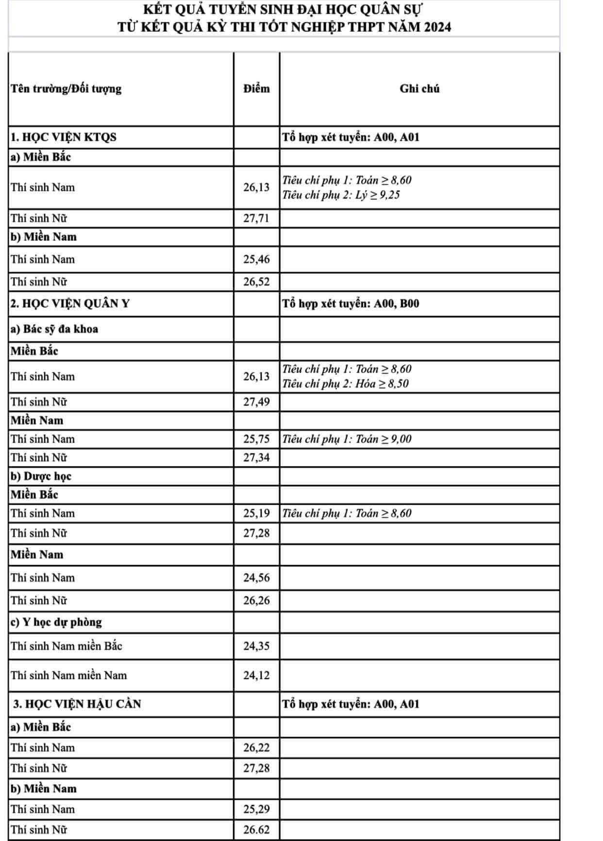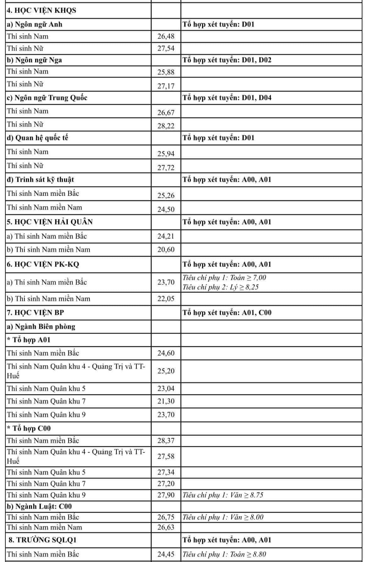Điểm chuẩn các trường quân đội như sau: