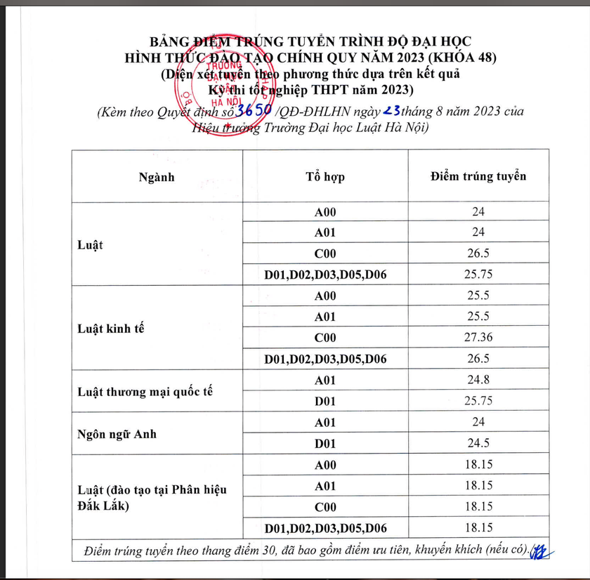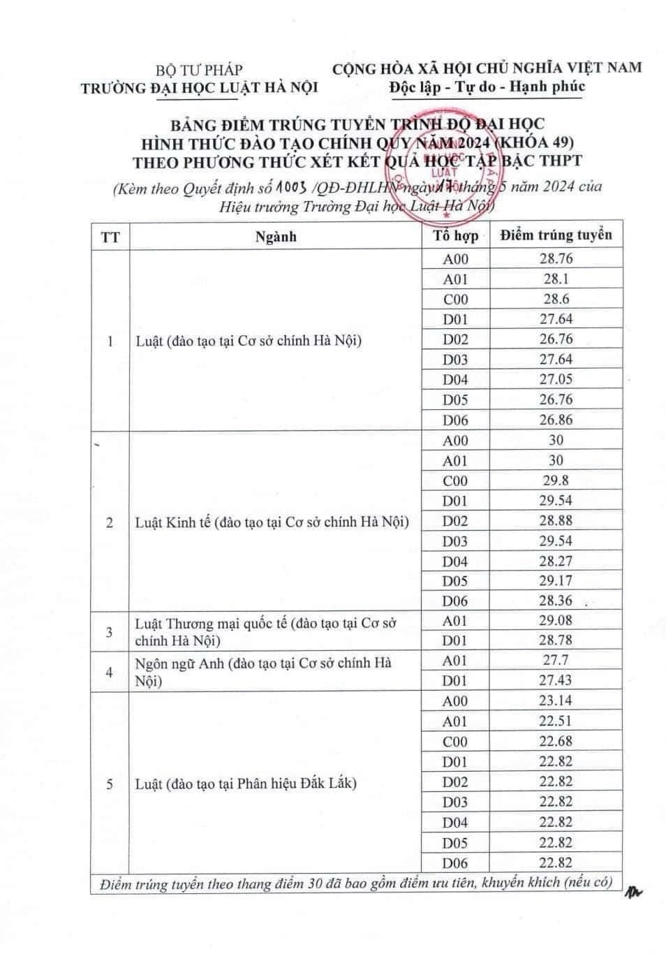 Điểm trúng tuyển theo phương thức xét tuyển kết quả học tập THPT năm 2024 của Trường Đại học Luật Hà Nội. |