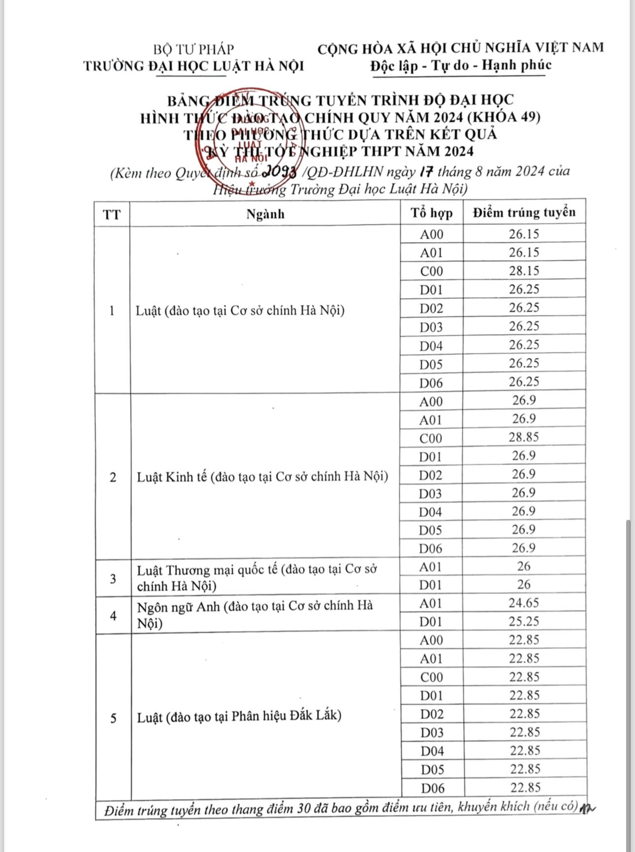 Điểm chuẩn Đại học Luật Hà Nội năm 2024 cao nhất 28,85