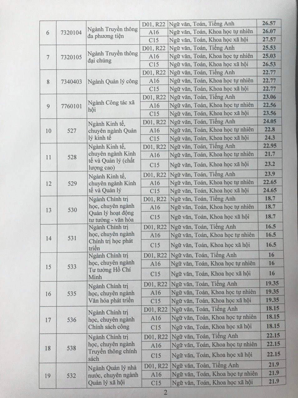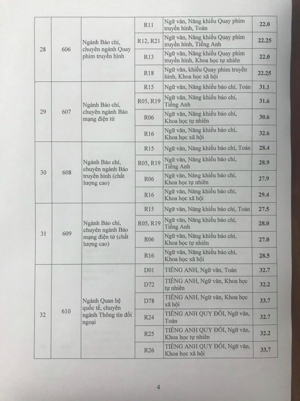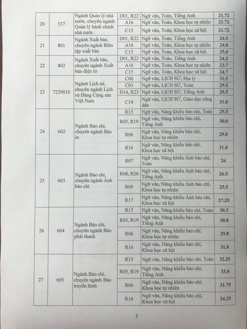 Cụ thể, các ngành Báo chí có điểm thi cao nhất so với các khối ngành khác. Điểm chuẩn đối với khoa Báo chí, chuyên ngành Báo truyền hình lên đến 34,25 điểm đối với tổ hợp R16. Trước đó, ngày 15/8, gần 1.500 thí sinh đăng ký dự thi Học viện Báo chí và Tuyên truyền đã tham gia vào vào bài thi Năng khiếu Báo chí.