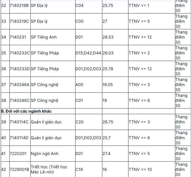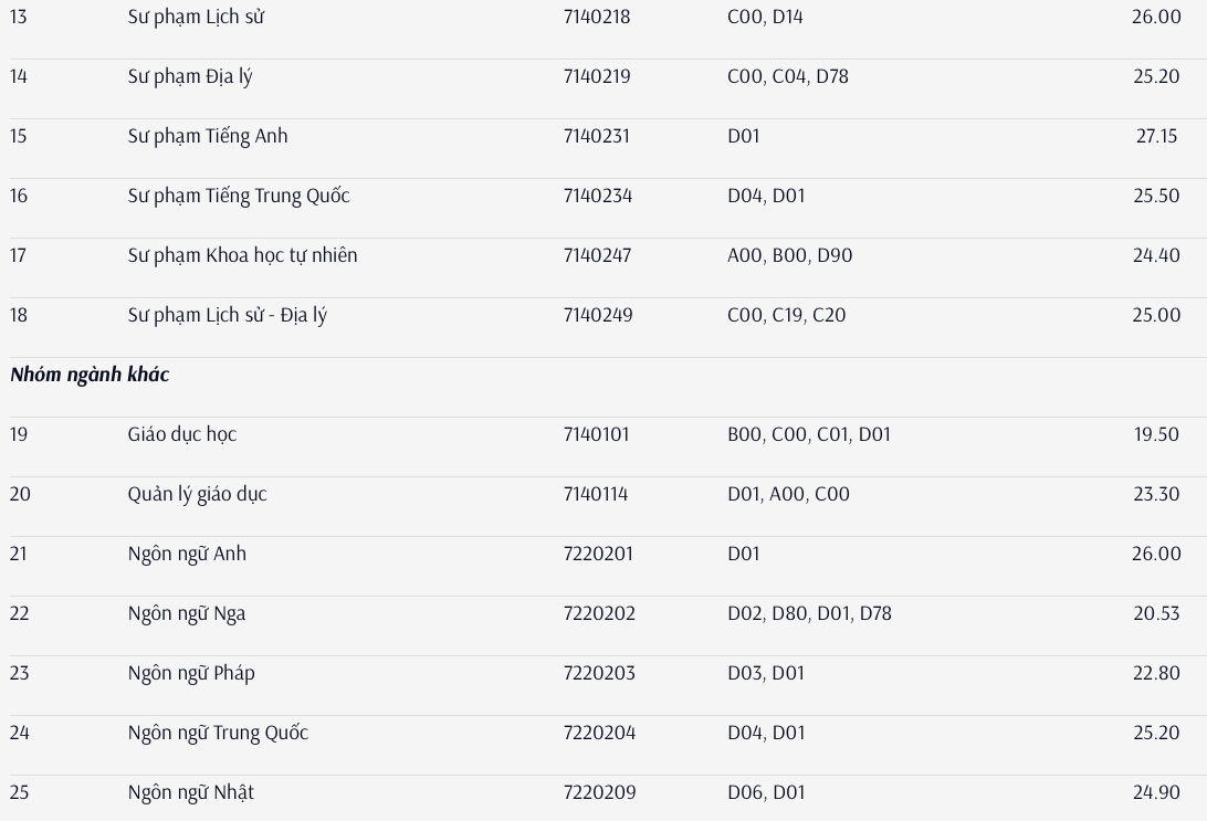 Cũng giống như trường Đại học Sư phạm TP HCM, ngành Sư phạm Tiếng Anh của trường Đại học Sư phạm Hà Nội có điểm chuẩn cao nhất là 28,53 điểm và với các ngành đào tạo khác, ngành Ngôn ngữ Tiếng Anh điểm chuẩn cao nhất với 27,4 điểm.