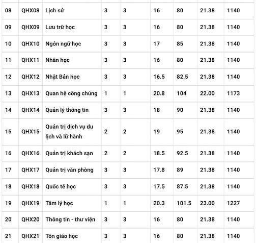 Với phương thức xét điểm thi đánh giá năng lực của Đại học Quốc gia Hà Nội, điểm chuẩn trúng tuyển thang 150 dao động từ 80 - 104 điểm, cao nhất là Quan hệ công chúng. Khi quy về thang điểm 30, mức điểm chuẩn dao động từ 16 - 20,8 điểm.
