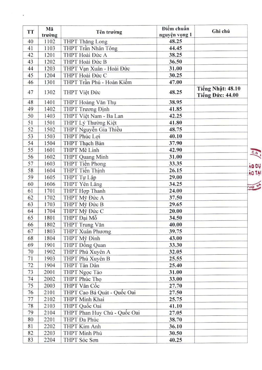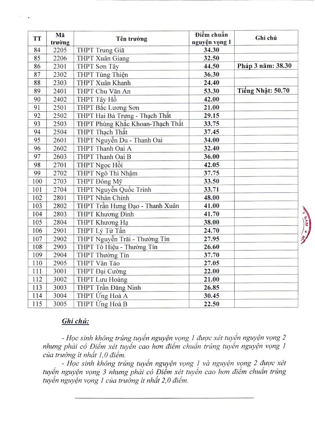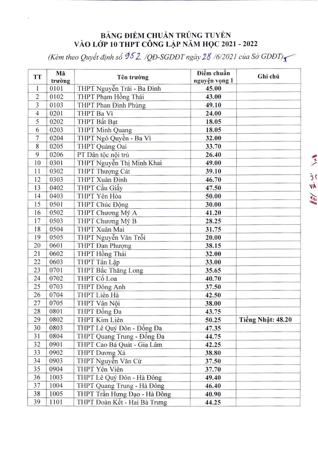 Theo quyết định của Sở GD&ĐT Hà Nội, điểm chuẩn vào các Trường cụ thể như sau: