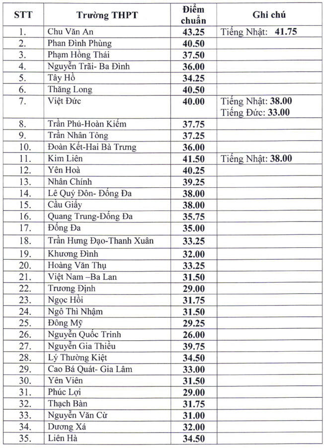 Theo đó, những trường THPT có điểm chuẩn cao gồm: trường Chu Văn An với 43,35 điểm; trường Kim Liên 41,5 điểm; 40,5 điểm là điểm chuẩn của trường THPT Phan Đình Phùng và THPT Thăng Long; trường THPT Yên Hoà 40,25 điểm, THPT Việt Đức 40 điểm...