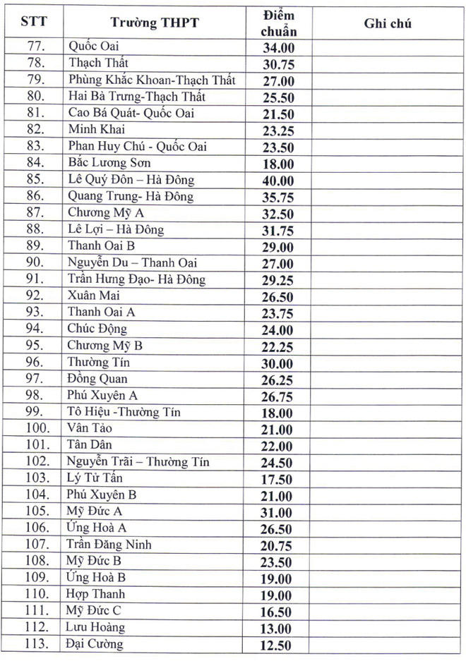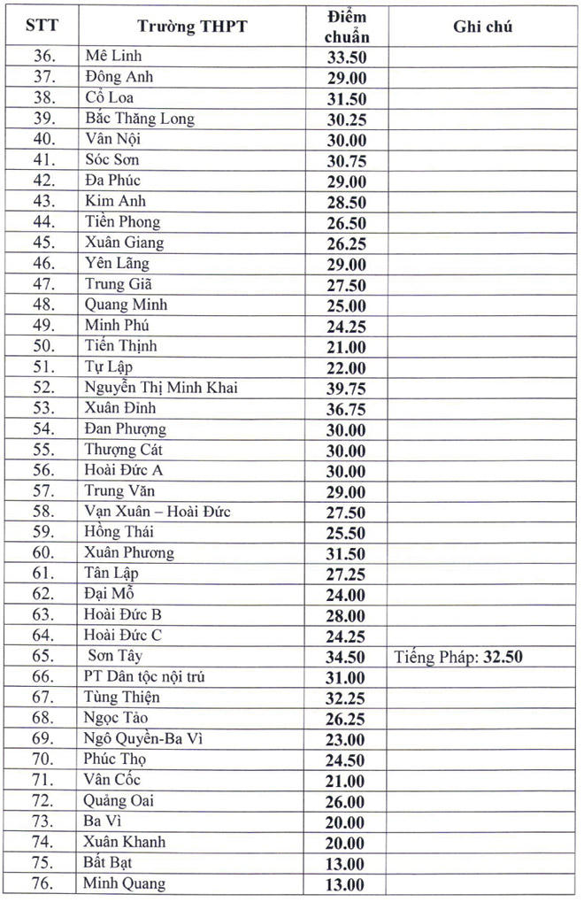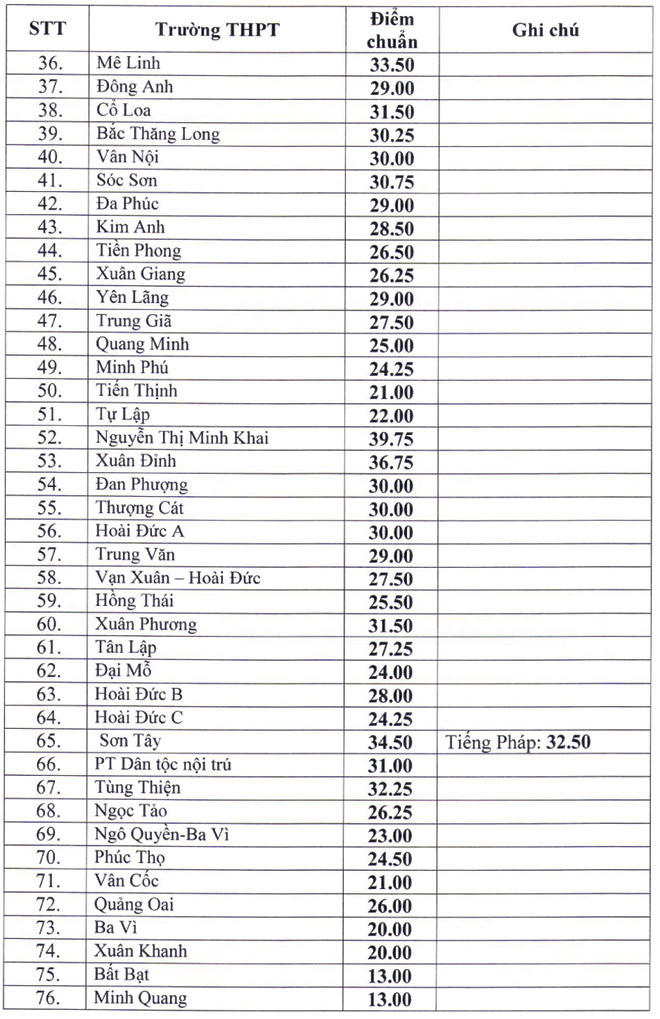 Thấp nhất trong danh sách này là các trường THPT Đại Cường 12,5 điểm; cùng số điểm chuẩn là 30 điểm có trường THPT Bất Bạt, trường THPT Minh Quang, trường THPT Lưu Hoàng...
