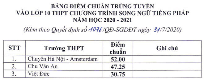 Trước đó, chiều ngày 31/7, Sở GD&ĐT đã công bố điểm chuẩn trúng tuyển vào lớp 10 THPT chuyên năm học 2020 - 2021 của 4 trường gồm: Trường chuyên Hà Nội Amsterdam; trường chuyên Nguyễn Huệ, trường THPT Chu Văn An và trường THPT Sơn Tây. Xem tại đây