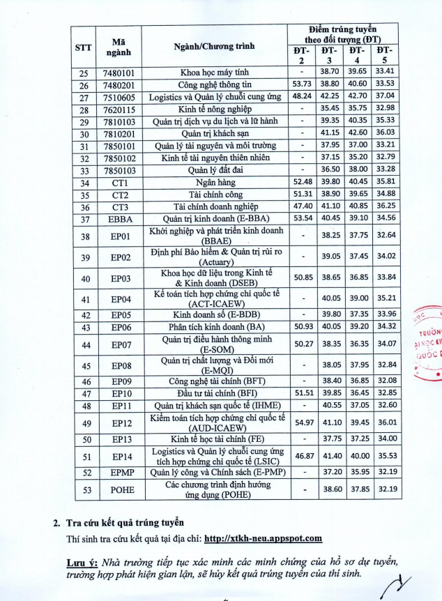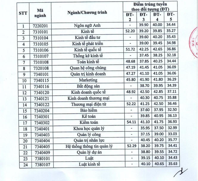 Theo thông tin trên website của Đại học Kinh tế quốc dân, điểm trúng tuyển theo điểm xét tuyển như sau: