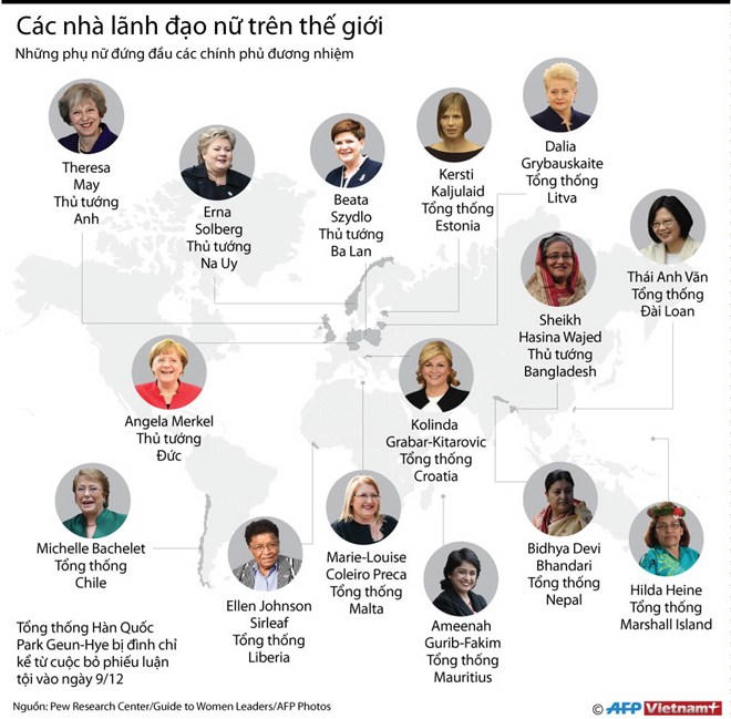 'Điểm danh' các nhà lãnh đạo nữ trên thế giới Thủ tướng Anh Theresa May, Thủ tướng Na Uy Erna Solberg, Thủ tướng Đức Angela Merkel... là những người phụ nữ quyền lực, đứng đầu các chính phủ đương nhiệm. Thứ Tư 08/03/2017 10:21 (GMT+7)