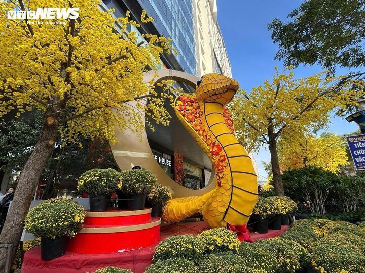 Phía dưới chú rắn hổ mang là hàng chục chậu cúc mâm xôi vàng rực cùng hai cây mai khổng lồ, tạo nên một khung cảnh xuân sang rực rỡ. Dù mang danh hổ mang chúa oai hùng, nhưng tạo hình của linh vật lại dễ thương bất ngờ, khiến bất kỳ ai cũng muốn ghé chụp ảnh, check-in để lưu giữ kỷ niệm.