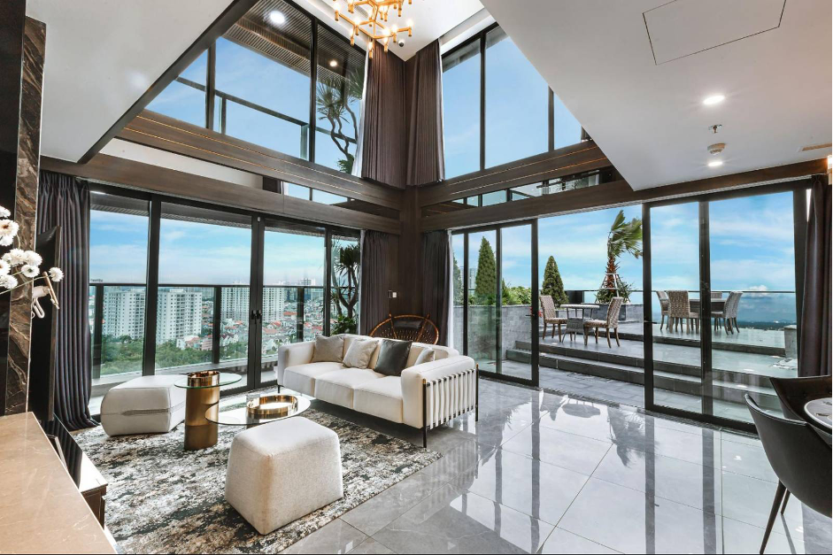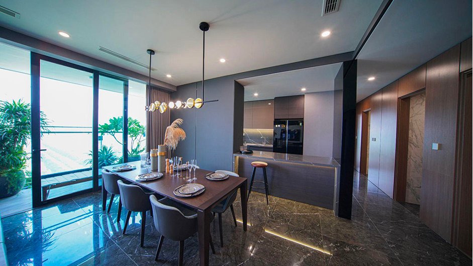 | Tô điểm cho các căn hộ có diện tích rộng rãi (từ gần 130m2 đến trên 300m2 đối với các căn 2-4 phòng ngủ; từ 240m2 đến gần 500m2 đối với các căn penthouse) là hệ kính Low-E cách nhiệt, chống ồn và hệ thống nội thất đến từ các thương hiệu nổi tiếng thế giới (Porta Door, Duravit, Hafele…). |