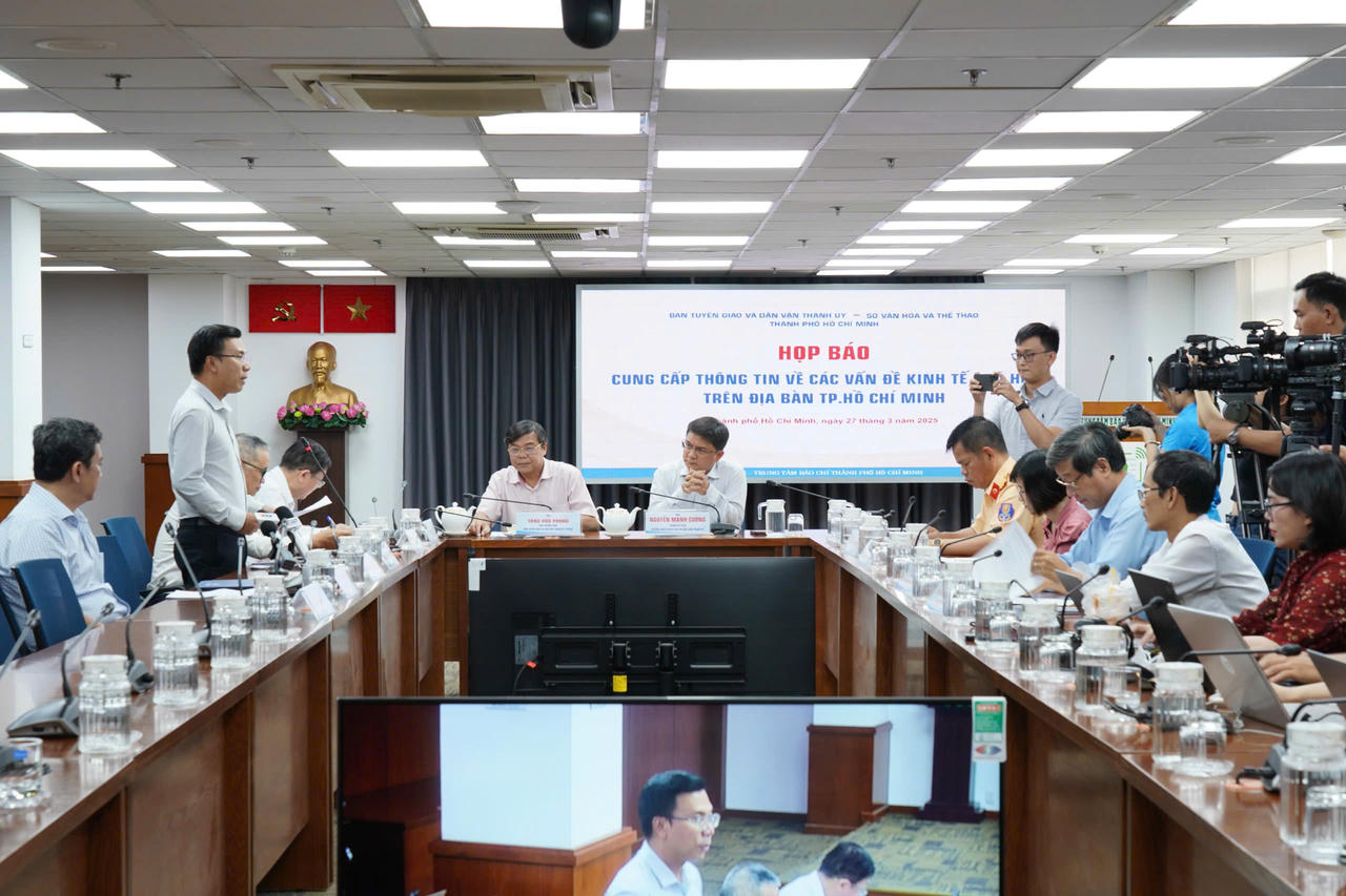 Các lãnh đạo trả lời tại họp báo định kỳ về tình hình kinh tế - xã hội trên địa bàn TP HCM chiều 27/3 |