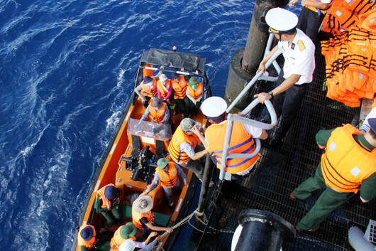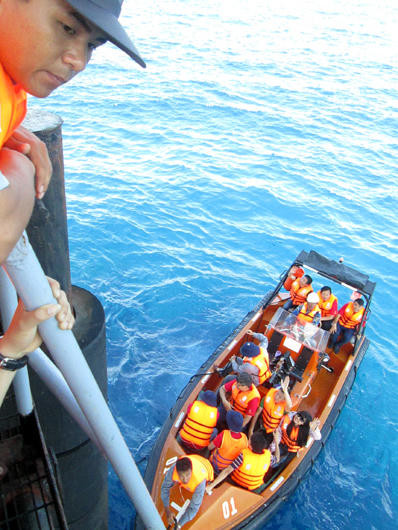 Tay xách nách mang, chân anh bước vội xuống xuồng chuyển tải, khi những cánh tay trên boong KN490 vẫy chào chúc anh vượt sóng an toàn.