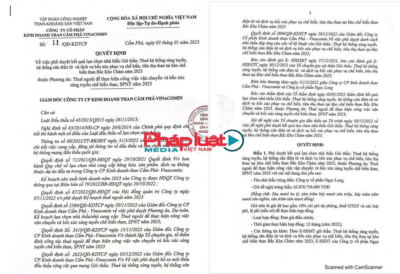 Ngày 28/12/2023, ông Nguyễn Anh Toán – Giám đốc Công ty Cổ phần Kinh doanh Than Cẩm Phả - Vinacomin lại ký quyết định số 3321/QĐ-KDTCP phê duyệt cho Công ty Ngọc Long trúng gói thuê hệ thống sàng tuyển tại kho than Bắc Khe Chàm năm 2024, giá trúng thầu 28.539.840.450 VNĐ. Thời gian thực hiện hợp đồng 365 ngày.
