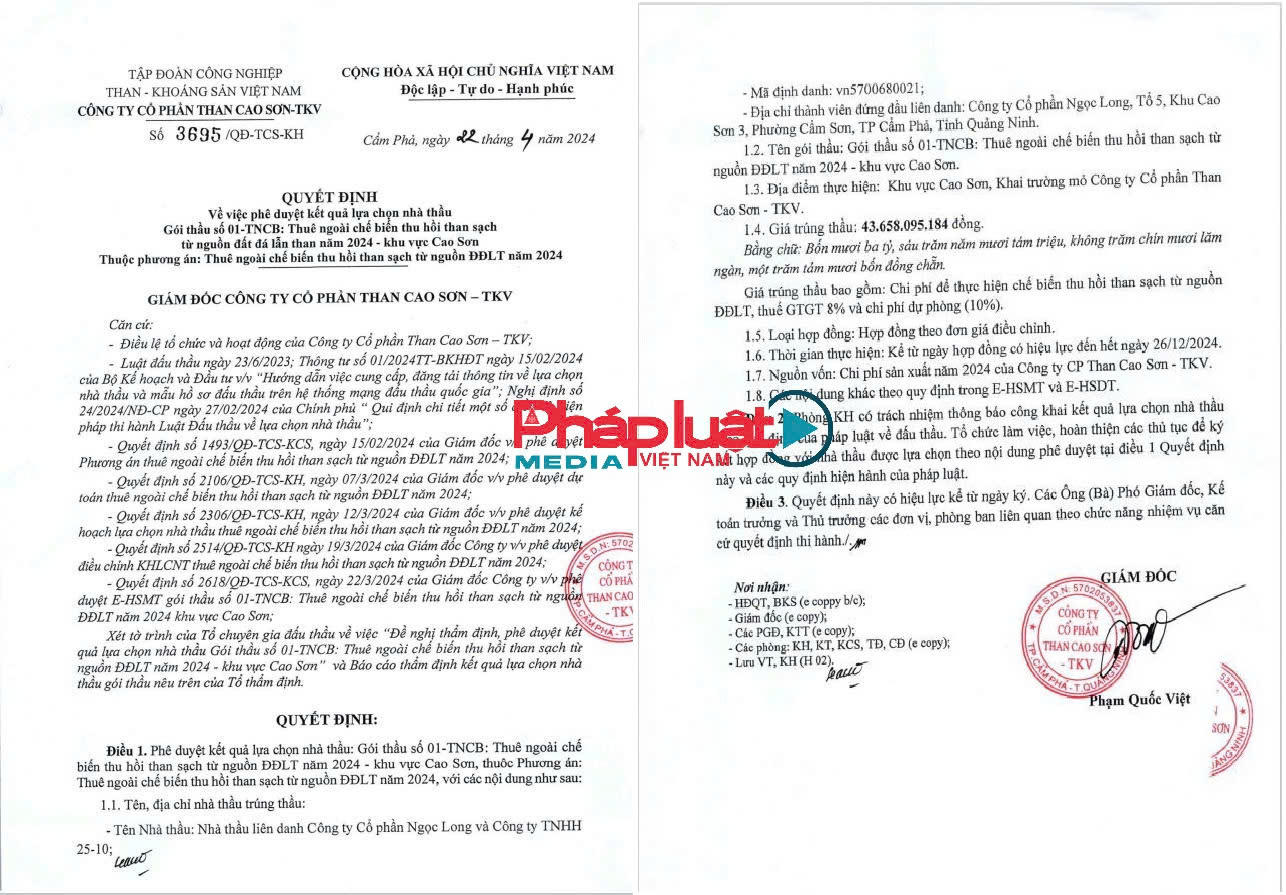 Ngày 22/4/2024, ông Phạm Quốc Việt – Giám đốc Công ty Cổ phần Than Cao Sơn – TKV ký quyết định 3695/QĐ-TCS-KH về việc phê duyệt kết quả lựa chọn nhà thầu cho gói thầu Gói thầu số 01-TNCB: Thuê ngoài chế biến thu hồi than sạch từ nguồn ĐĐLT năm 2024 - khu vực Cao Sơn. Theo đó, với vai trò là liên danh chính, Công ty Ngọc Long và Công ty TNHH 25-10 vẫn là đơn vị được lựa chọn triển khai gói thầu trên với giá trúng thầu là 43.658.095.184 VND, tỷ lệ giảm giá 0%, thời gian thực hiện hợp đồng hết 26/12/2024.