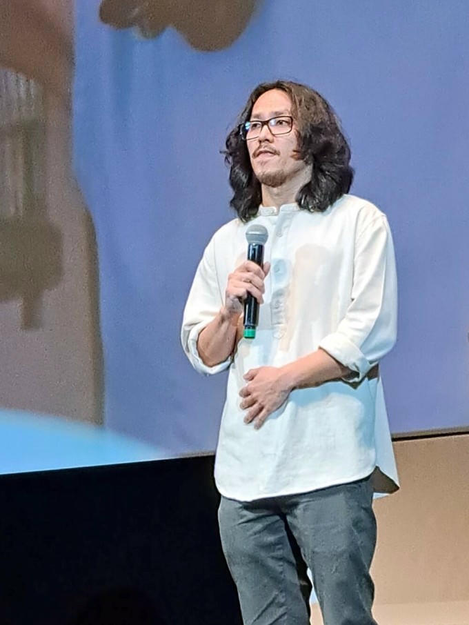Đạo diễn Phạm Thiên Ân phát biểu tại buổi ra mắt phim Bên trong vỏ kén vàng ở Cannes. (Ảnh Dana Armanni) |