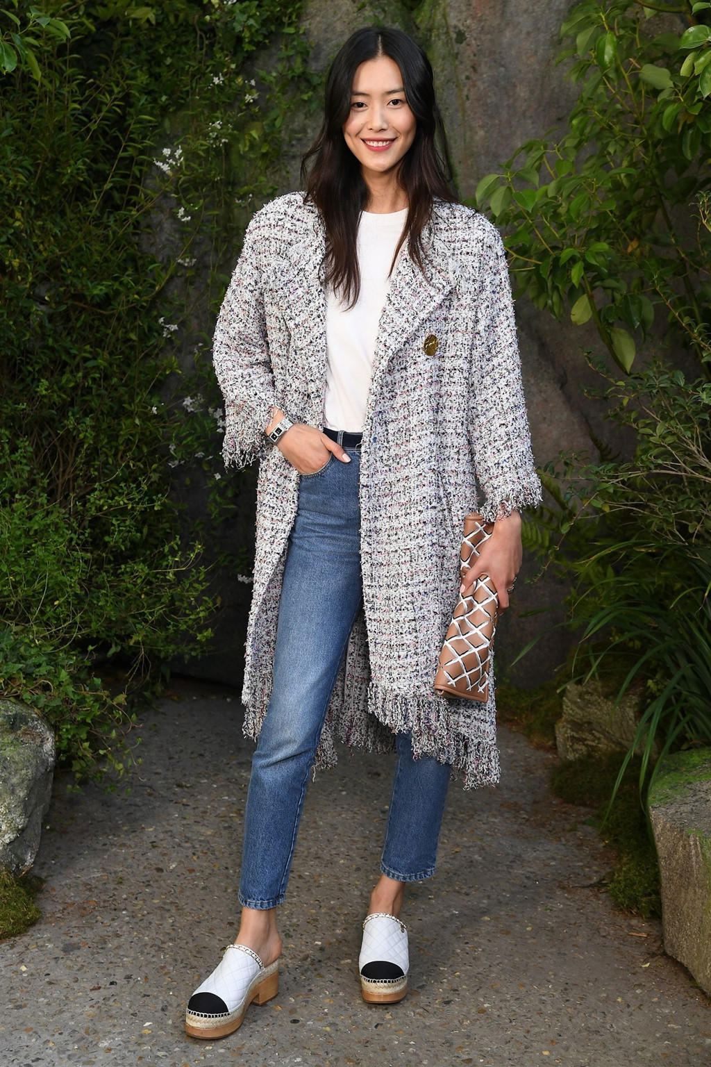 Liu Wen ấn tượng với phong cách cổ điển cùng áo khoác vải tweed tua rua cá tính và quần jeans xanh.