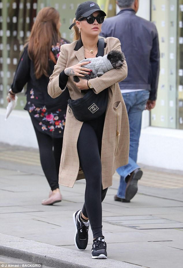 Rita Ora dạo phố thoải mái với áo khoác vải tweed kẻ cùng legging và giày thể thao sành điệu.