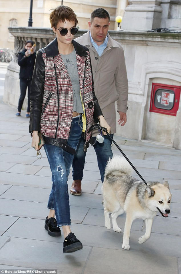 Cara Delevingne cá tính với thiết kế jacket vải tweed phối da.