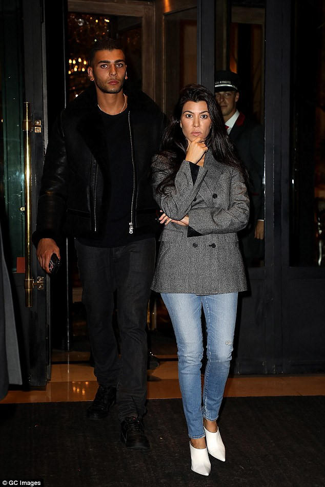 Kourtney Kardashian chọn áo blazer màu xám thanh lịch mix cùng skinny jeans và giày mules trắng sành điệu.
