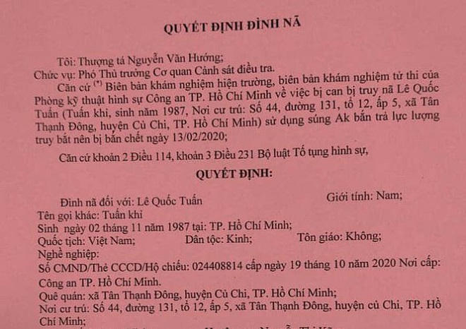Quyết định đình nã dựa trên căn cứ biên bản khám nghiệm hiện trường, biên bản khám nghiệm tử thi của Phòng kỹ thuật hình sự Công an TP HCM về việc bị can bị truy nã Lê Quốc Tuấn sử dụng súng AK bắn trả lực lượng truy bắt nên bị bắn chết ngày 13/2.