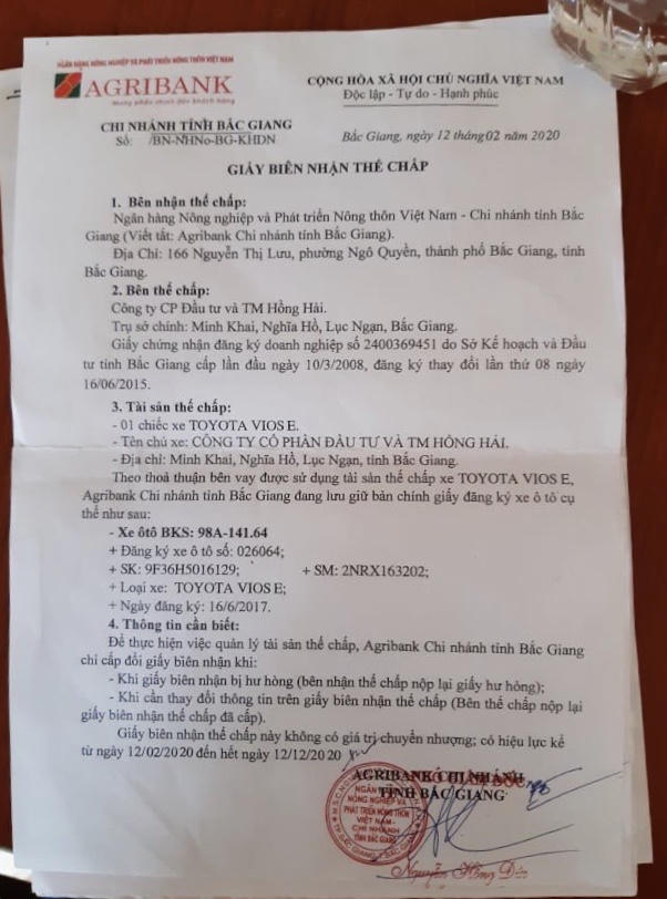 Cụ thể, Công ty Hồng Hải (văn phòng giao dịch số nhà 77 Hoàng Quốc Việt, Xương Giang, TP Bắc Giang) yêu cầu anh Hoàng Văn Tú đánh xe ô tô biển số 98A- 141.64 (hợp đồng mua bán số 406 giữa anh Tú và Công ty Hồng Hải) xuống Công ty để ngân hàng Agribank Bắc Giang định giá lại, trong khi đó anh Tú không có bất kỳ giao dịch nào với ngân hàng.