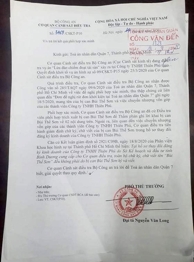 Mới đây, CQĐT Bộ Công an có Văn bản 3469/CSKT-P10 gửi TAND quận 7 trả lời kết quả phối hợp xác minh. Theo đó, CQĐT nhận được Công văn 285/TAQ7 ngày 9/6/2020 của TAND quận 7 về việc đề nghị phối hợp xác minh, thu thập chứng cứ liên quan “Đơn đề nghị rút đơn khởi kiện tại TAND quận 7” ghi ngày 18/5/2020 của ông Sơn và việc chuyển nhượng vốn góp của các thành viên Thiên Phú.