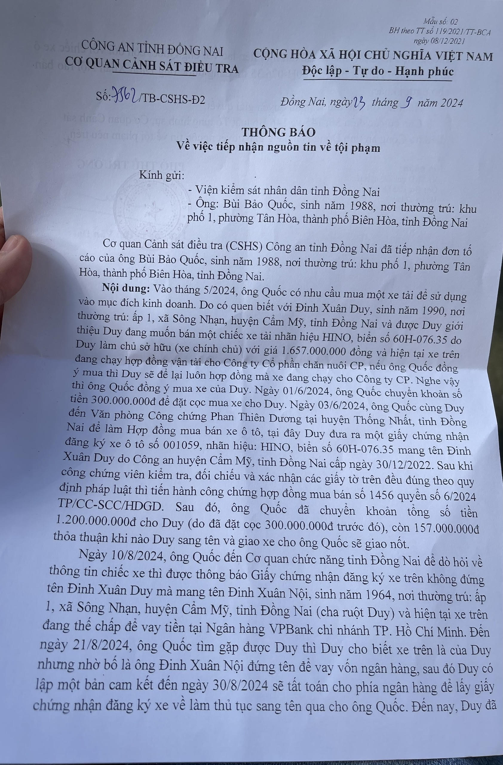 (PLVN) - Sau khi PLVN có bài “Nghi án làm giả giấy tờ xe lừa tiền tỷ” phản ánh việc ông Bùi Bảo Quốc (SN 1988, ngụ Tân Hòa, TP Biên Hòa) tố giác sự việc ông Đinh Xuân Duy (SN 1990, ngụ ấp 1, xã Sông Nhạn, huyện Cẩm Mỹ, cùng tỉnh Đồng Nai) dùng giấy tờ (cà vẹt) có dấu hiệu bị làm giả bán xe nhằm chiếm đoạt 1,5 tỷ đồng; ngày 23/9/2024, Cơ quan CSĐT Công an Đồng Nai đã ra Thông báo số 7562/TB-CSHS-DD2 tiếp nhận nguồn tin về tội phạm và đang tiến hành điều tra, xác minh.
