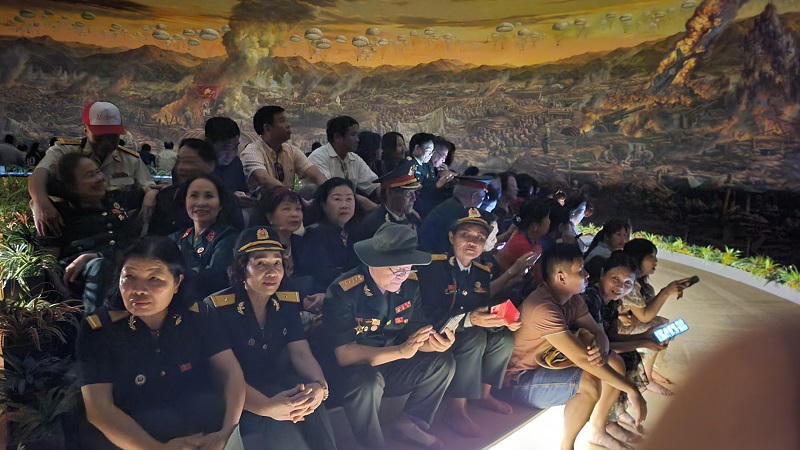 Du khách đến trải nghiệm bức tranh Panorama tái hiện toàn cảnh chiến dịch Điện Biên Phủ.