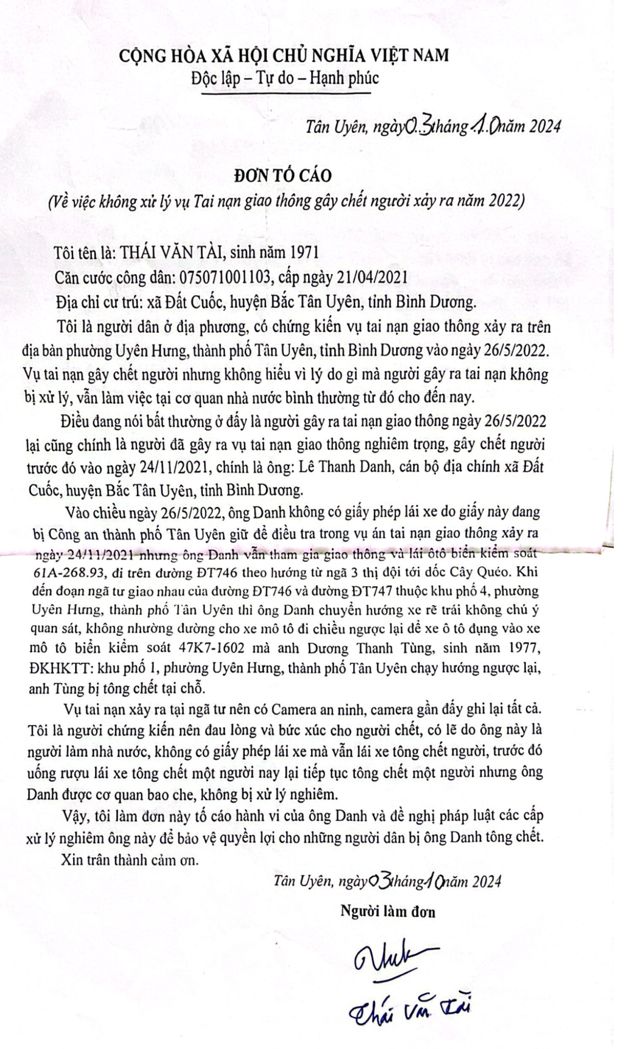 Tuy nhiên, với vụ TNGT thứ hai xảy ra vào ngày 26/5/2022, cho rằng còn một số vấn đề cần làm rõ nên người dân đã có đơn gửi đến các cơ quan chức năng Bình Dương. VKSND tỉnh Bình Dương sau đó cũng có văn bản ngày 28/11/2024 chuyển nội dung phản ánh “về việc không xử lý vụ TNGT gây chết người xảy ra năm 2022” đến VKSND TP Tân Uyên để kiểm sát theo thẩm quyền, trả lời người dân và thông báo kết quả kiểm sát đến VKSND tỉnh.