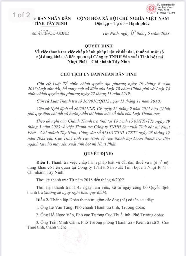 Ngày 8/12/2022, ông Nguyễn Tấn Lợi, Cục trưởng Cục Thuế Tây Ninh ký Văn bản 6133/CTTNI-TTKT2 gửi UBND tỉnh, đề nghị lập đoàn thanh tra liên ngành gồm Thanh tra, Cục Thuế, Sở TN&MT, KHĐT, Công an tỉnh “thanh tra toàn diện Nhà máy Nhựt Phát”. Ngày 9/6/2023, UBND tỉnh ra Quyết định 1236/QĐ-UBND “thanh tra việc chấp hành pháp luật về đất đai, thuế và một số nội dung khác có liên quan tại Nhà máy Nhựt Phát”.