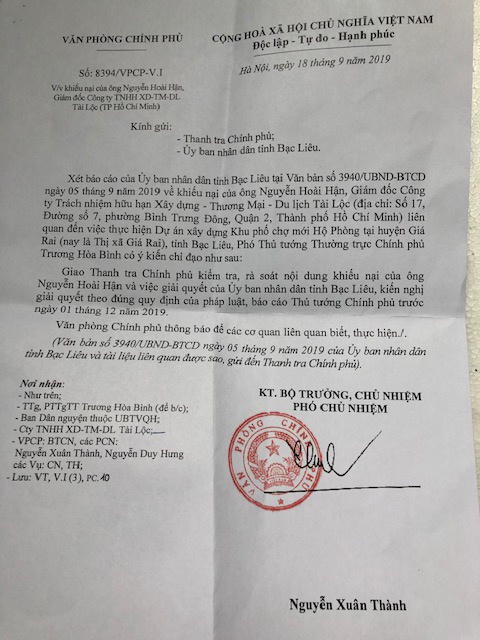 Ngày 23/7/2019, Văn phòng Chính phủ có Công văn 6516/VPCP-V.I gửi UBND Bạc Liêu thực hiện theo chỉ đạo của Phó Thủ tướng Trương Hòa Bình như sau: Yêu cầu UBND tỉnh Bạc Liêu khẩn trương giải quyết dứt điểm khiếu nại của ông Hận theo thẩm quyền, đúng quy định pháp luật, báo cáo kết quả lên Thủ tướng trước ngày 1/10/2019.