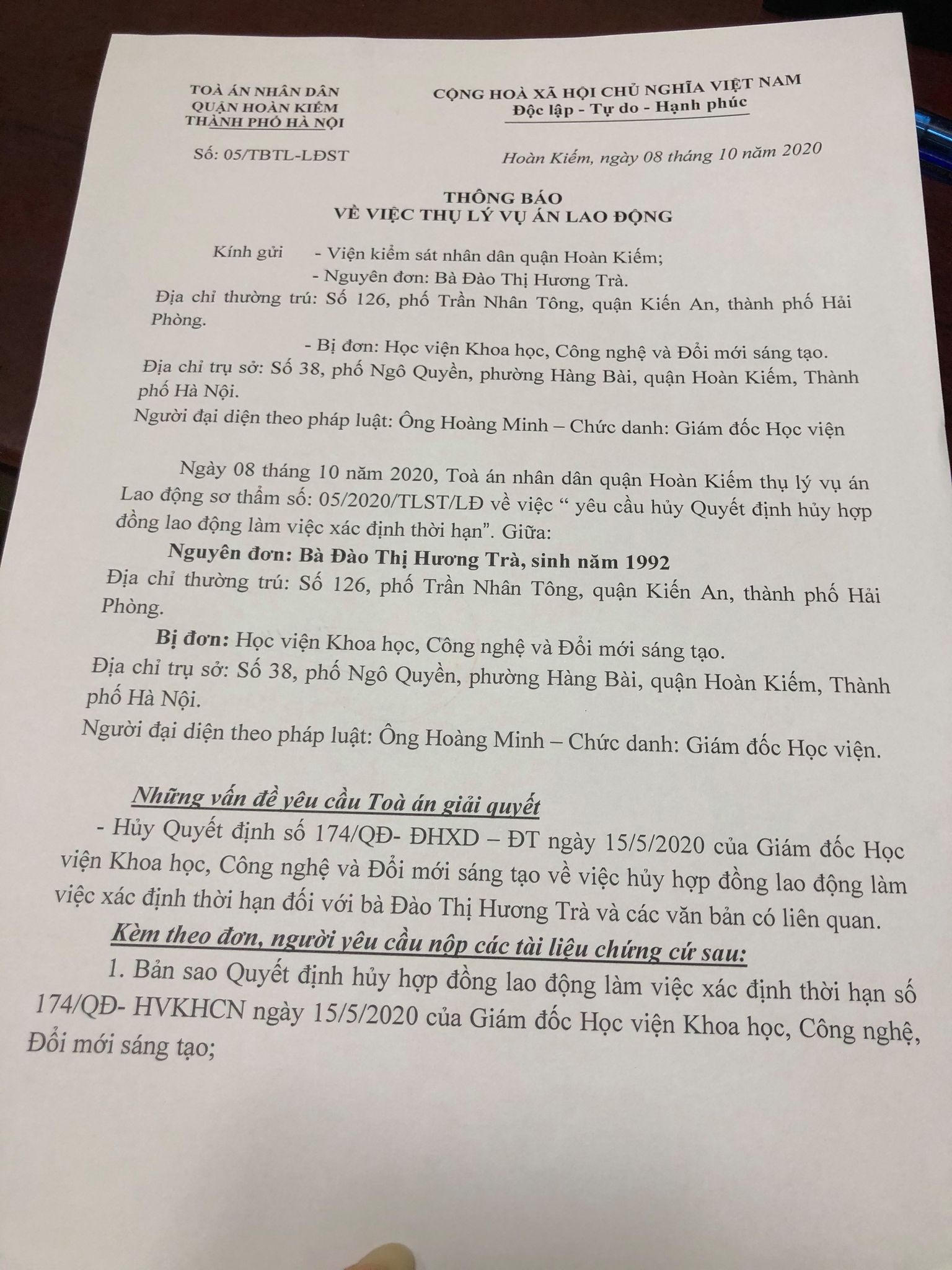 Thông báo số 05/TBTL-LĐST do thẩm phán Nguyễn Đức Quân ký, cho biết, ngày 8/10/2020, TAND quận Hoàn Kiếm thụ lý vụ án Lao động về việc “Yêu cầu hủy Quyết định hủy hợp đồng lao động làm việc xác định thời hạn” giữa nguyên đơn bà Đào Thị Hương Trà, bị đơn Học viện KHCN, người đại diện theo pháp luật là ông Hoàng Minh, GĐ Học viện.