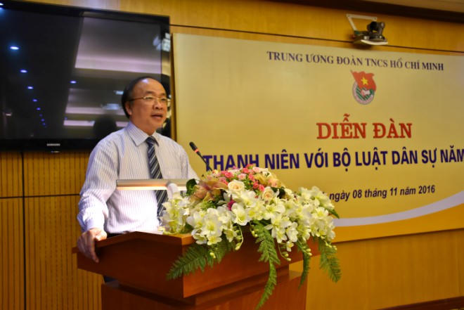 (PLO) - Nhằm hưởng ứng Ngày Pháp luật nước CHXHCN Việt Nam 9/11/2016, sáng 8/11, Trung ương Đoàn TNCS Hồ Chí Minh phối hợp với Bộ Tư pháp tổ chức Diễn đàn với chủ đề “Thanh niên với Bộ luật Dân sự năm 2015”. Bí thư Đảng ủy, Thứ trưởng Bộ Tư pháp Phan Chí Hiếu, Bí thư Trung ương Đoàn TNCS Hồ Chí Minh Nguyễn Ngọc Lương cùng đại diện lãnh đạo Đoàn khối, Đoàn thanh niên các đơn vị cùng tham dự Diễn đàn