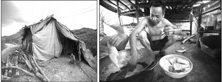 Vẻ e dè ban đầu giữa chủ và khách được xóa nhanh vì chúng tôi được giới thiệu là người thân quen, nhưng thái độ cảnh giác không vơi chút nào. Như bao bãi vàng khác ở vùng núi, rừng bị đào bới lỗ chỗ, nhìn từ trên cao, đất đỏ, vàng đùn ra như hang chuột, dòng suối ở chân núi, chảy từ các khe, đục ngầu, hôi thối.