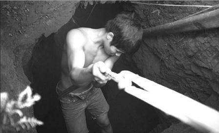 “Căn hầm này sâu khoảng 100m”. Ở phía gần miệng hầm thẳng đứng, sâu hút xuống độ chừng 15m thì hầm không còn dốc đứng, chia làm mấy nhánh ngang, dọc dưới lòng đất. Muốn xuống hầm, phải đu dây, thả tời. Trong nhóm luân phiên, cứ hai người nhảy xuống đào chừng khoảng một tiếng thì ngoi lên, ở trên dùng tời kéo đất đá. Tại một điểm khác là nơi lọc quặng, bên cạnh gần chục công nhân là một dãy sàng chạy ầm ầm, nước và hóa chất phun thẳng xuống khe.