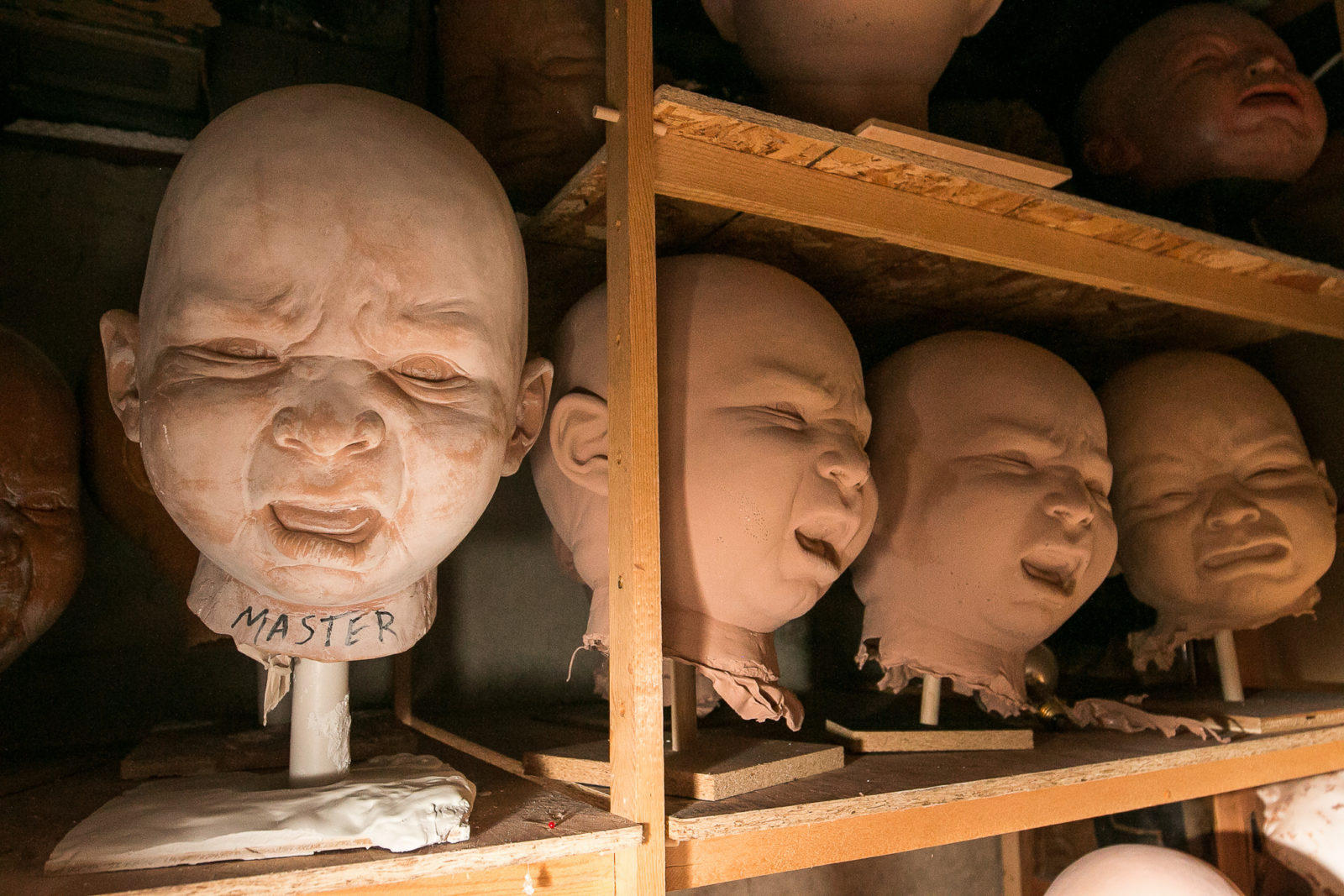 | Các khuôn mặt nạ đầu người Hyperflesh được trưng bày ngay tại bàn làm việc của Landon Meier ngay tại tư gia |