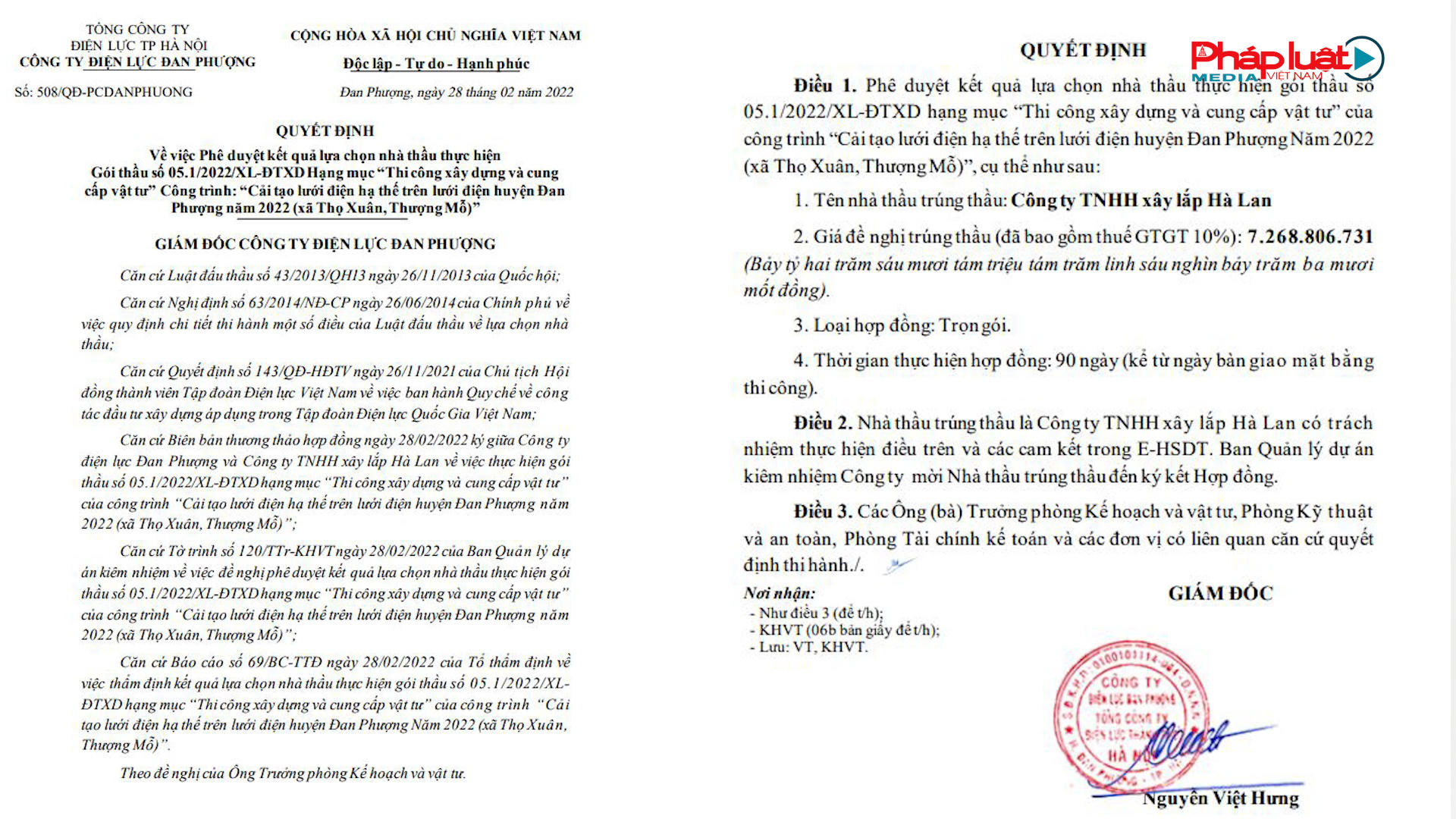 Cụ thể, ngày 28/02/2022, ông Nguyễn Việt Hưng – Giám đốc PC Đan Phượng đã phê duyệt kết quả số 508/QĐ-PCDANPHUONG cho Công ty TNHH xây lắp Hà Lan trúng gói thầu số 05.1/2022/XL-ĐTXD hạng mục “Thi công xây dựng và cung cấp vật tư” của công trình “Cải tạo lưới điện hạ thế trên lưới điện huyện Đan Phượng năm 2022 (xã Thọ Xuân, Thượng Mỗ)”, trị giá hơn 7,2 tỷ đồng.