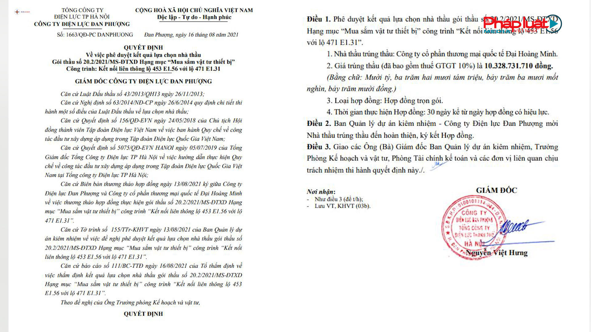 Gói thầu số 20.2/2021/MS-ĐTXD Hạng mục “Mua sắm vật tư thiết bị” thuộc Dự án Công trình “Kết nối liên thông lộ 453 E1.56 với lộ 471 E1.31”, với giá gói thầu 10.434.244.256 đồng và giá trúng thầu 10.328.731.710 đồng theo Quyết định (PDKQ) số 1663/QĐ-PCDANPHUONG ngày 16/08/2021.