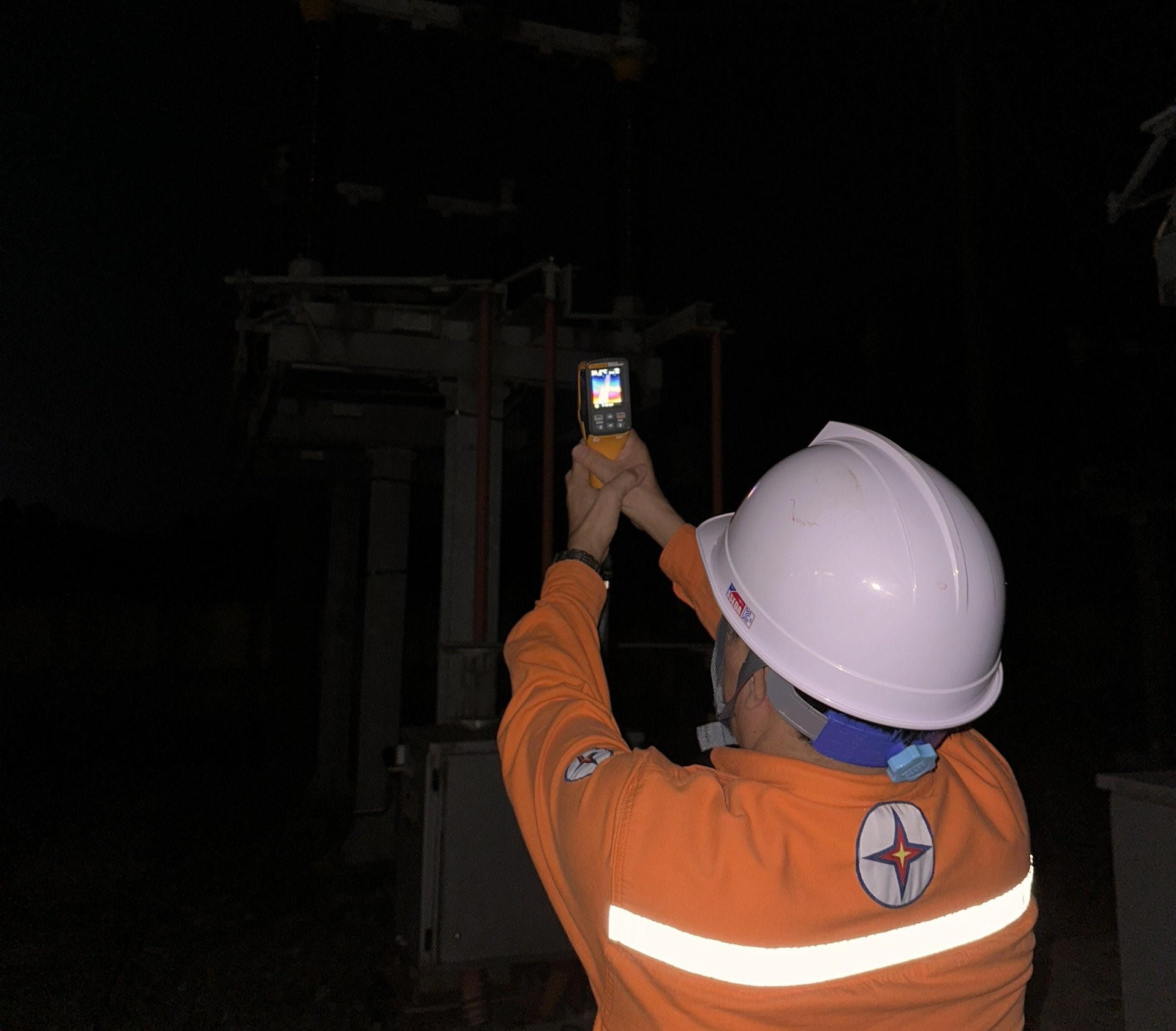 Nhân viên điện lực Hà Tĩnh sử dụng súng bắn nhiệt để kiểm tra hiện trường vào ban đêm. Ảnh: PV |