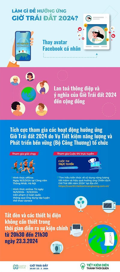 Vận động công nhân viên chức, người lao động tham gia cuộc thi trực tuyến “Tìm hiểu kiến thức về sử dụng năng lượng tiết kiệm và hiệu quả” hưởng ứng chiến dịch Giờ Trái đất năm 2024. Cuộc thi tổ chức từ ngày 16/3/2024 - 31/3/2024 tại địa chỉ https://tietkiemnangluong.com.vn/.