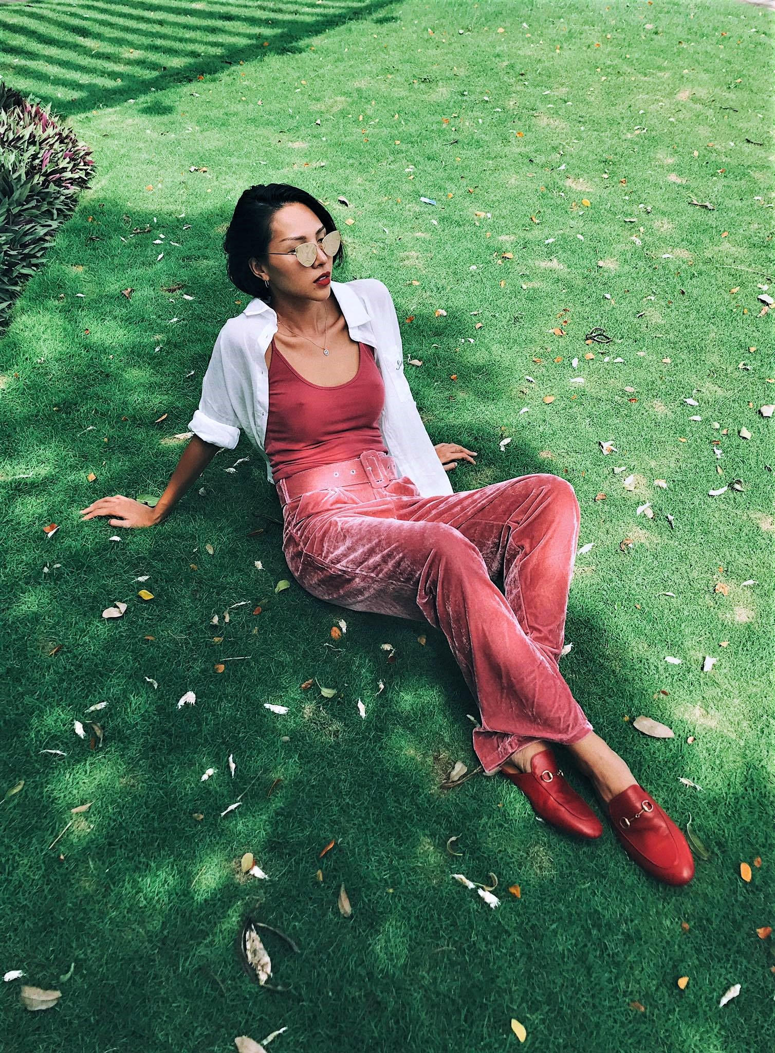 Mặc cho thời tiết có nóng bức, Minh Triệu vẫn lựa chọn cho mình chiếc quần ống rộng velvet màu đỏ phối với áo sát cánh và sơ mi trắng để mang đến một tổng thể quyến rũ. Đôi loafer màu đỏ sành điệu là item “ăn ý” hoàn hảo cho tổng thể bộ trang phục.