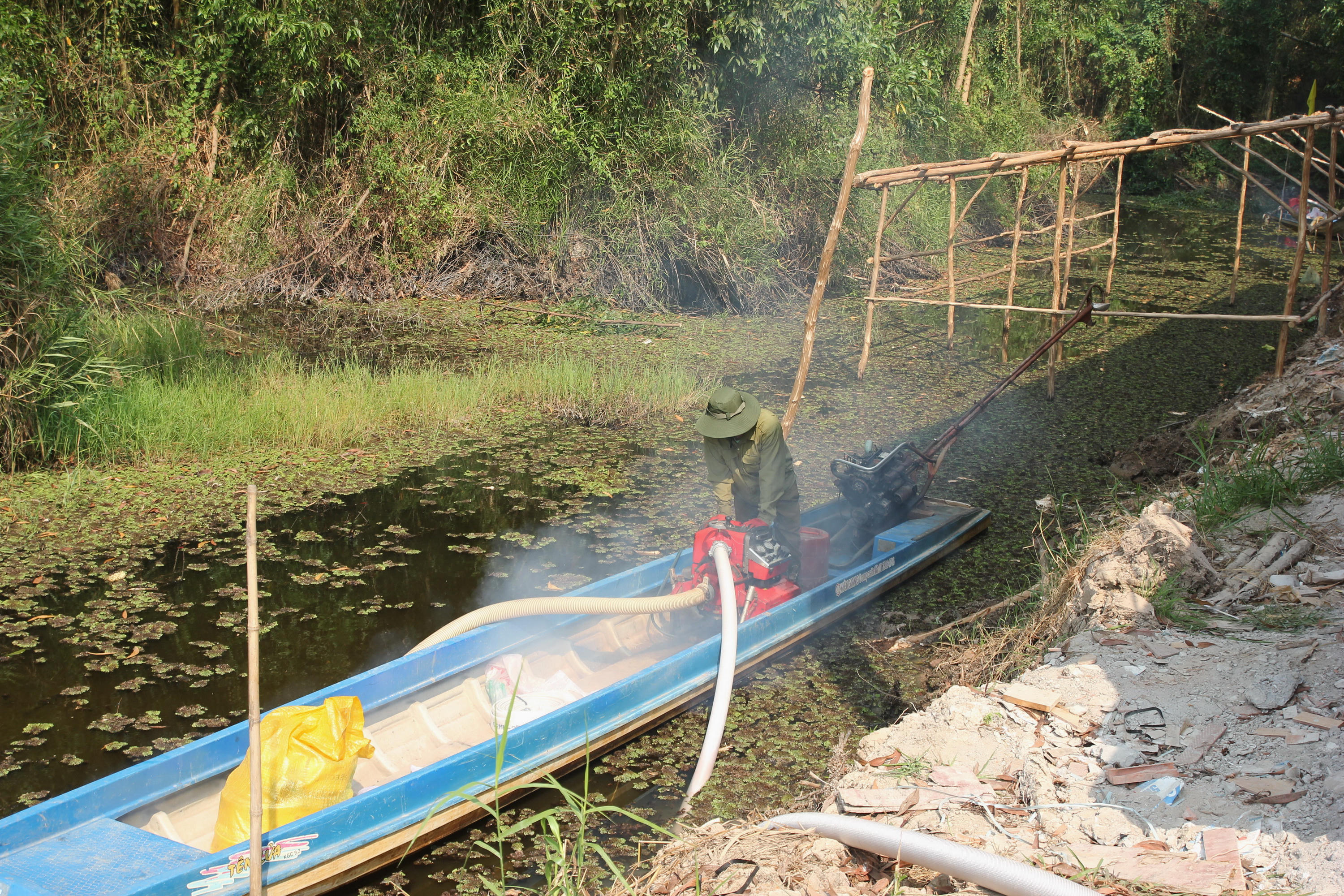 Lực lượng bảo vệ rừng vận hành máy bơm. |