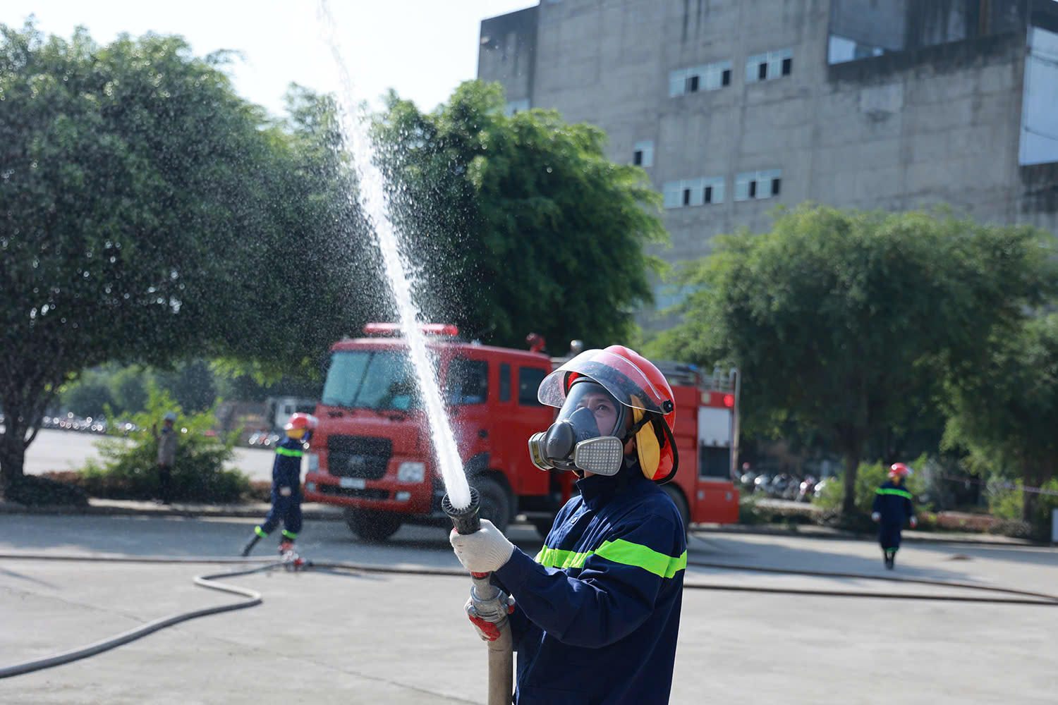 Triển khai đội hình theo xe chữa cháy, phun nước làm mát, dập lửa, xử lý khói độc, hạn chế phạm vi phát tán khói, khí độc. |