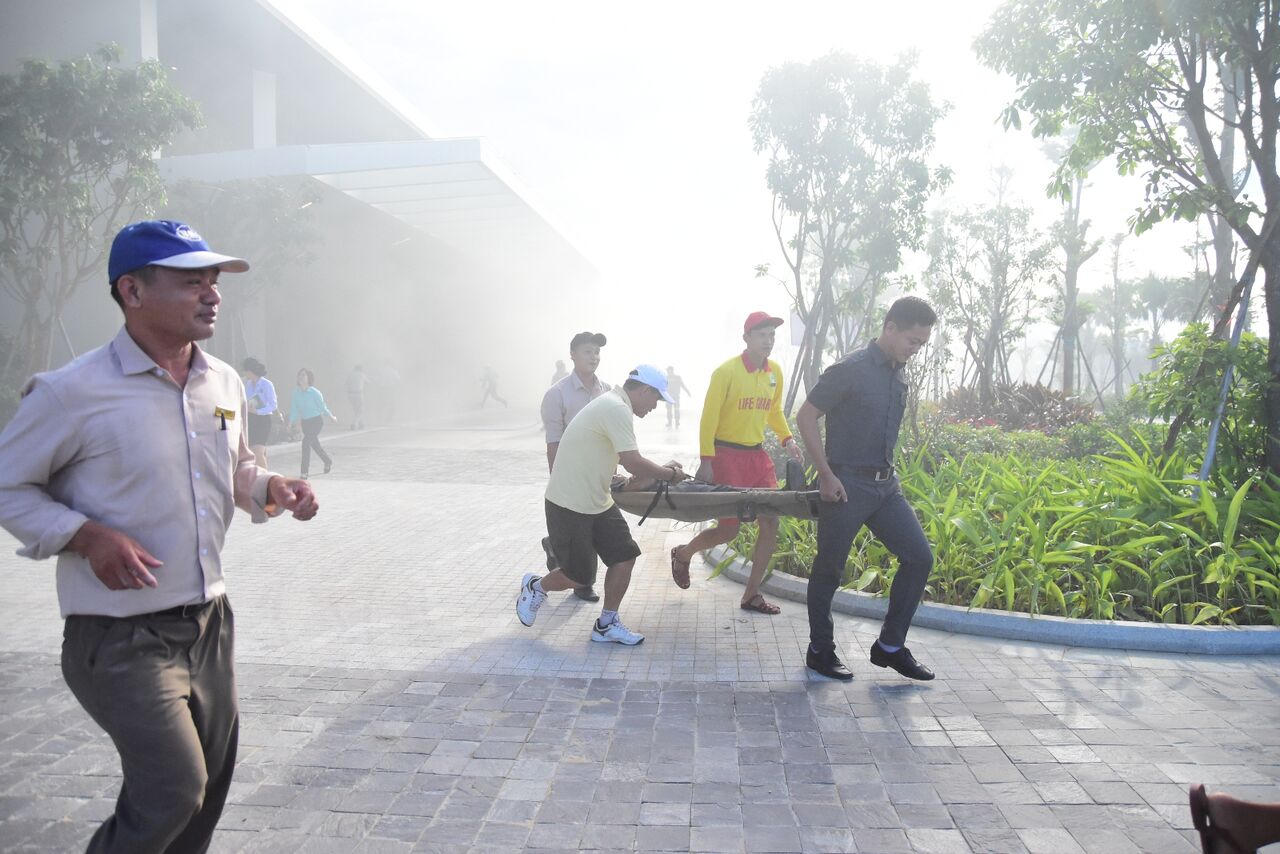 Theo tình huống giả định, ngọn lửa đã bùng cháy tại Trung tâm, nhanh chóng lan sang các khu vực bên cạnh, khói ngập lối đi, hành lang và phòng họp. Ngay lập tức, các chuyên viên an ninh và đội cứu hộ tiếp cận đưa đại biểu đến lối thoát hiểm, sơ cứu, đồng thời vận chuyển người bị nạn ra ngoài. Đội cứu hộ bấm còi báo cháy, triển khai toàn bộ hệ thống cứu hỏa, các vòi phun nước và gọi khẩn cấp cho đội cứu hỏa chuyên dụng của thành phố.